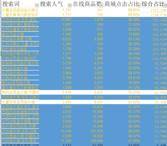 因为我们要找搜索热度高,在线商品少的词!c店要尽量选取商城点击占比50%以下的相关关键词,因为数据显示此时50%以上都进了天猫店,那么你选择他只会竞争更加的激烈!