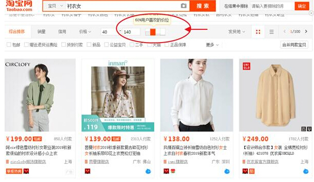 选款的价格上,我们可以通过对比此类产品的销售价格层级,选择符合销售价在这一层级中的产品。当然这里我们要算好进价和销售价格。例如下图,我们搜索衬衣女,可以看到60%的用户选择了价位在40-140之间的产品,那么我们在选款的时候,就应该选择销售价可以再40-60之间这一价位的产品。其流量必定会比其他少数用户喜欢的产品更高。