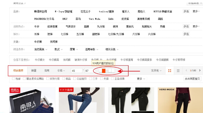 价格是一个很敏感的因素,它不仅仅对于转化率有很大影响,而且也是标签里很重要的一个因素。我们打开淘宝,关键词搜索,我们可以看到,每一个款商品其价格都有相应的价格阶段。也有相应的人群对应,因此我们需要首先检查我们店铺的商品价格阶段是否制定的混乱。例如牛仔裤,当我们搜素牛仔裤的时候,在下方会看到一个价格阶段的显示。